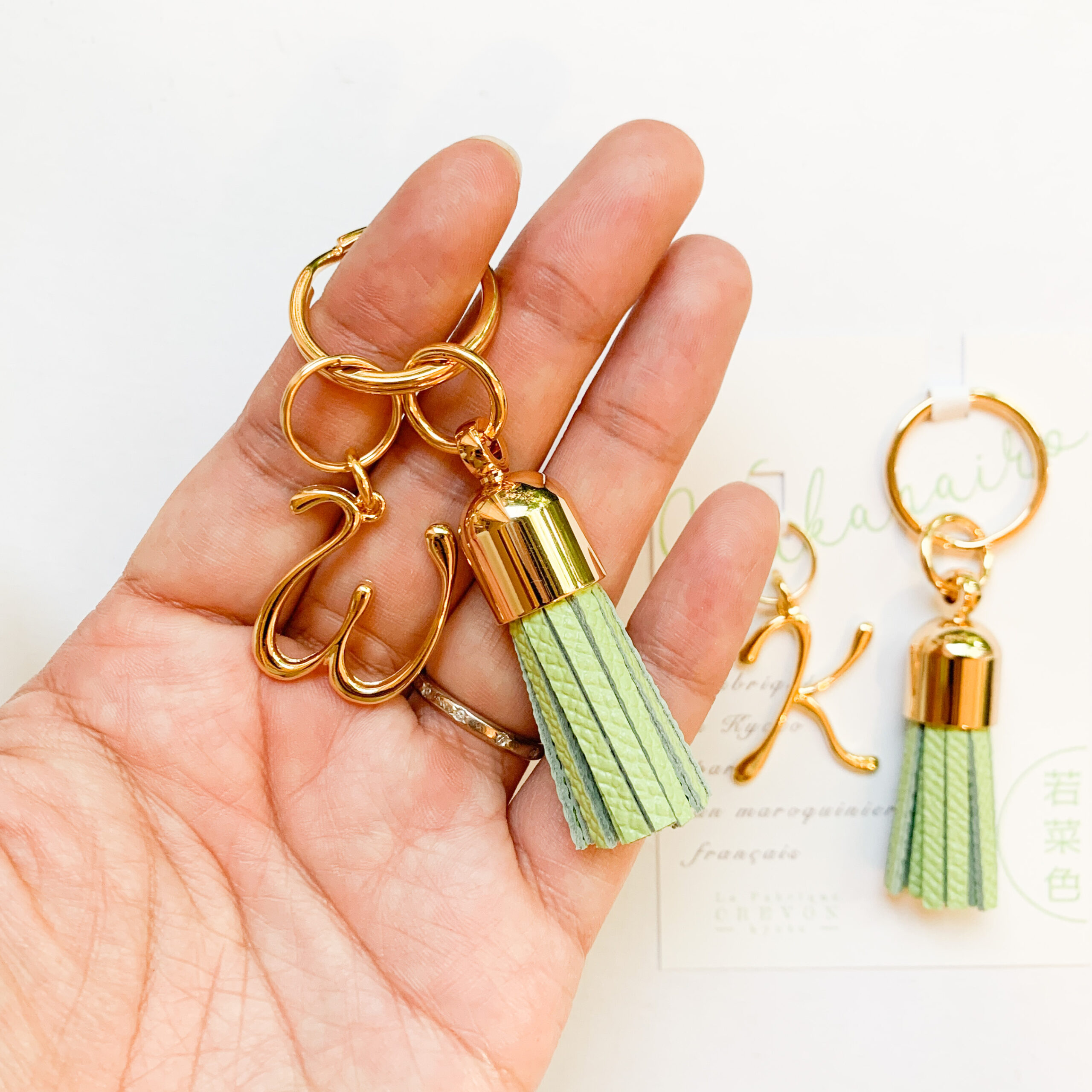 プレゼントとして人気なイニシャルチャーム付きタッセルキーホルダーです。